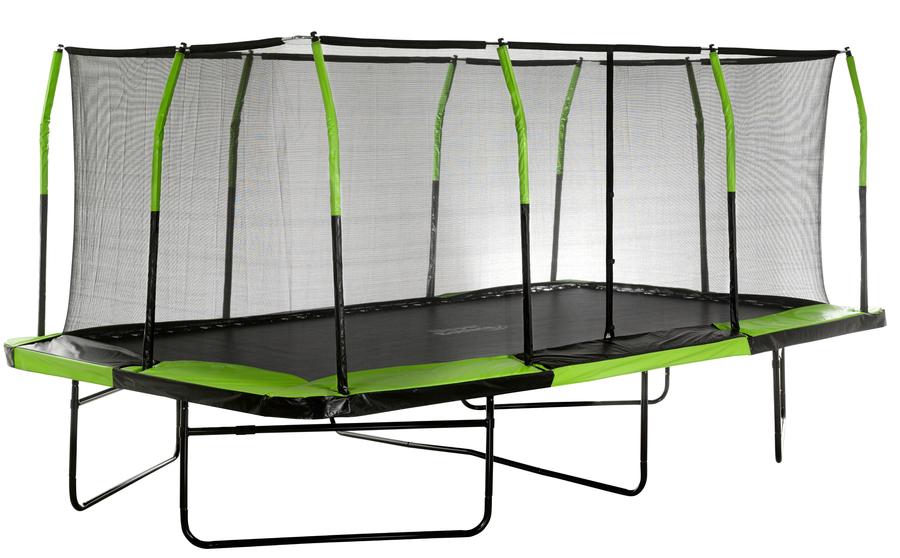 A safety enclosure is a net which surrounds the trampoline and prevents the users from falling. While the old trampolines used rigid steel poles to hold the nets, the new trampolines are spring free which too uses the same composite rod, but supports the beam to retain all the weight of the bouncer and throwing them back to the center.